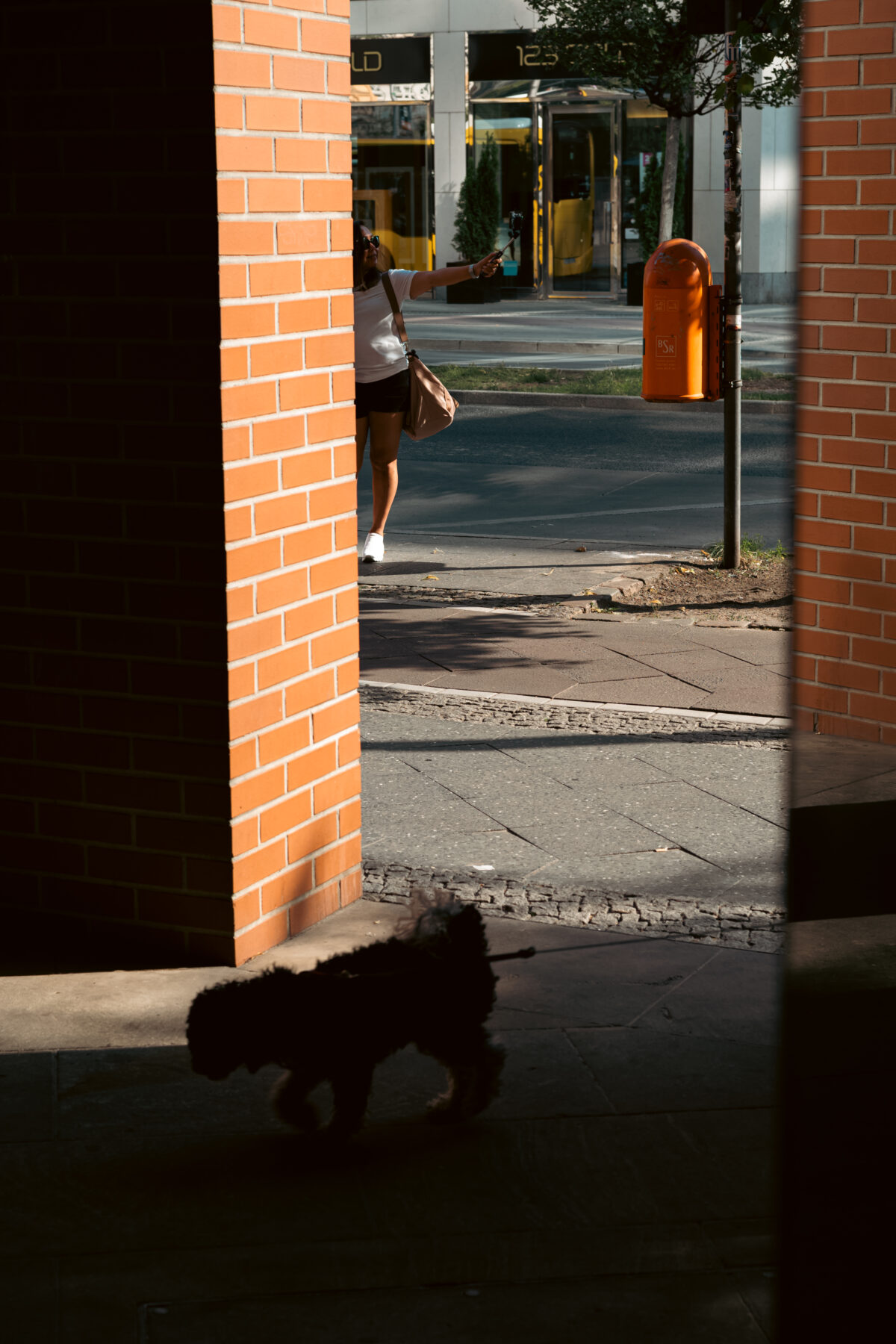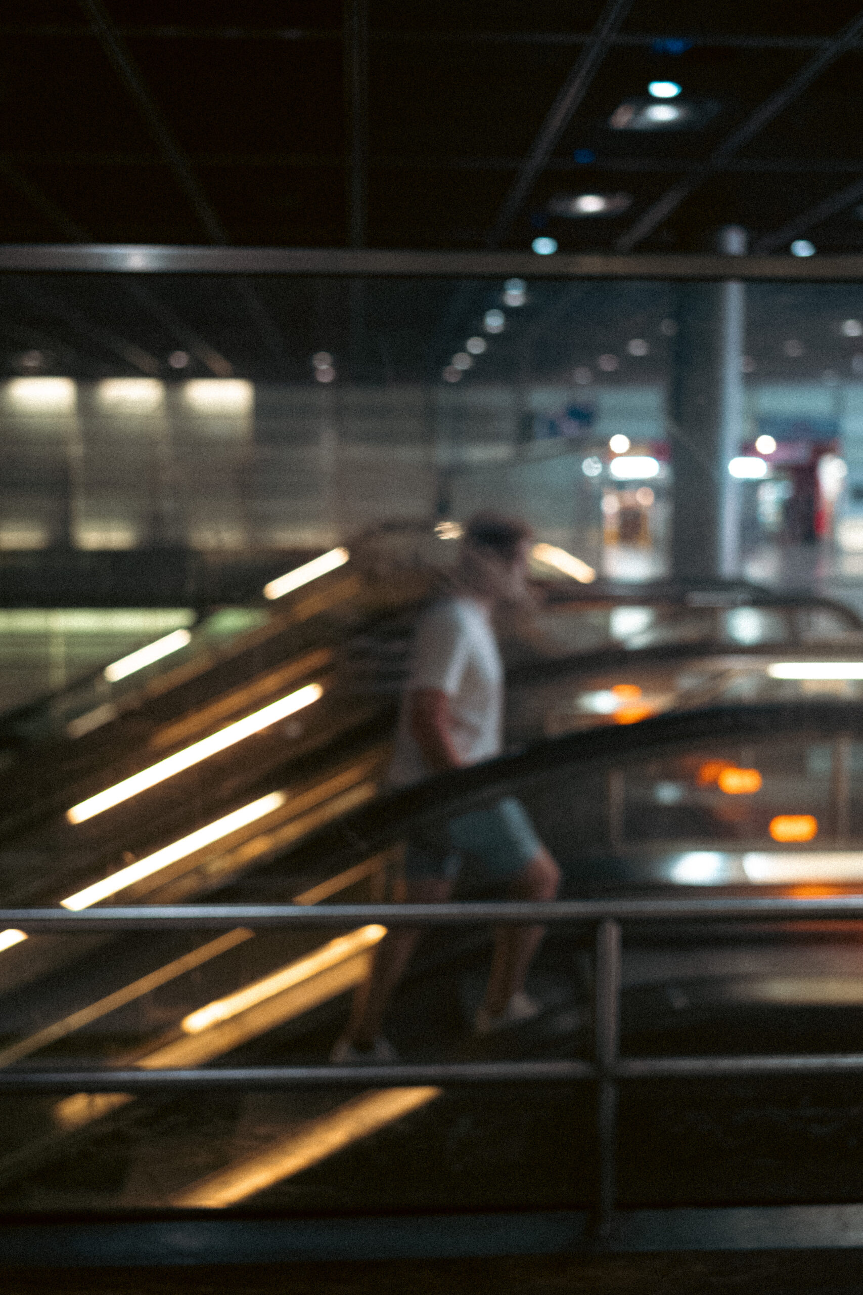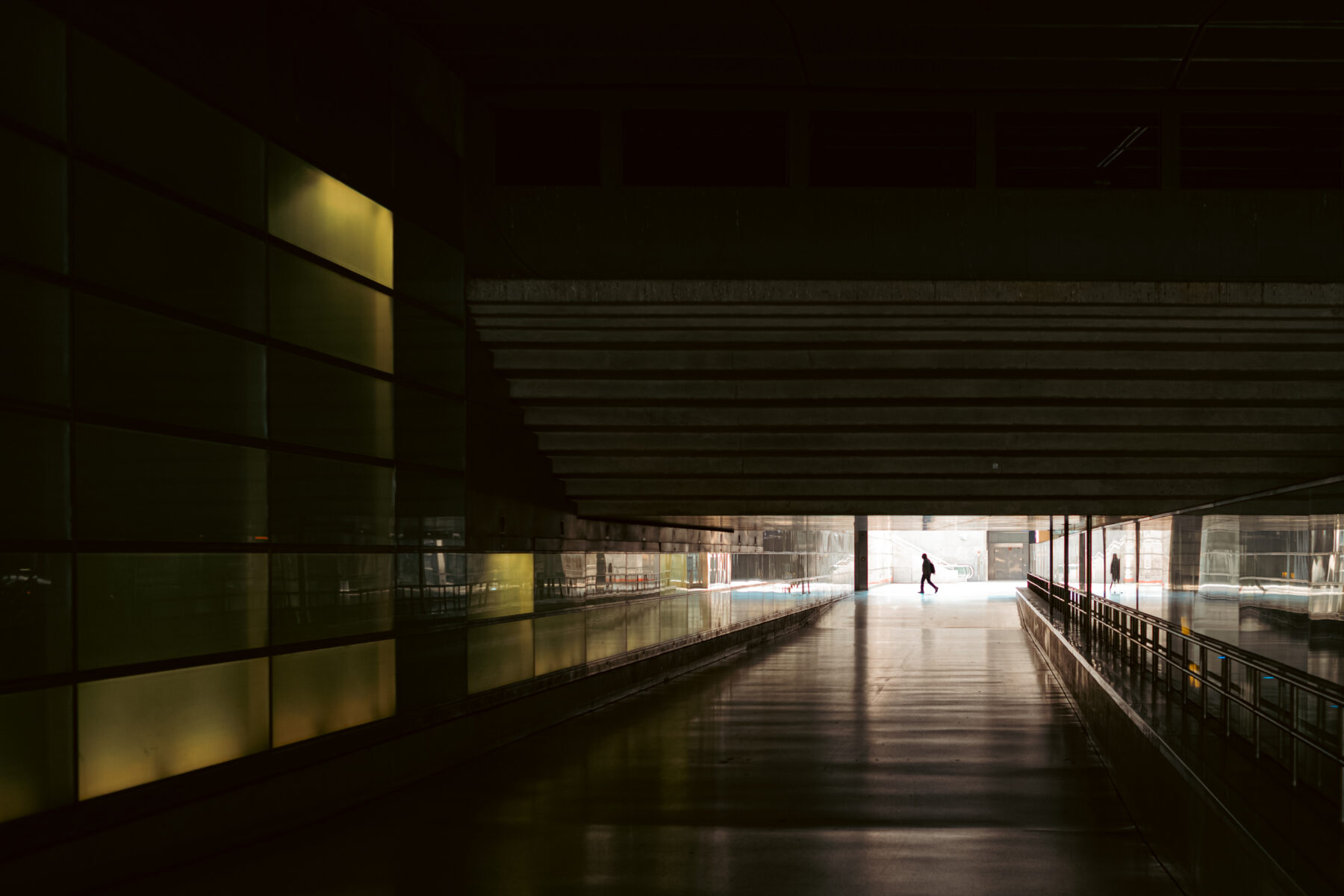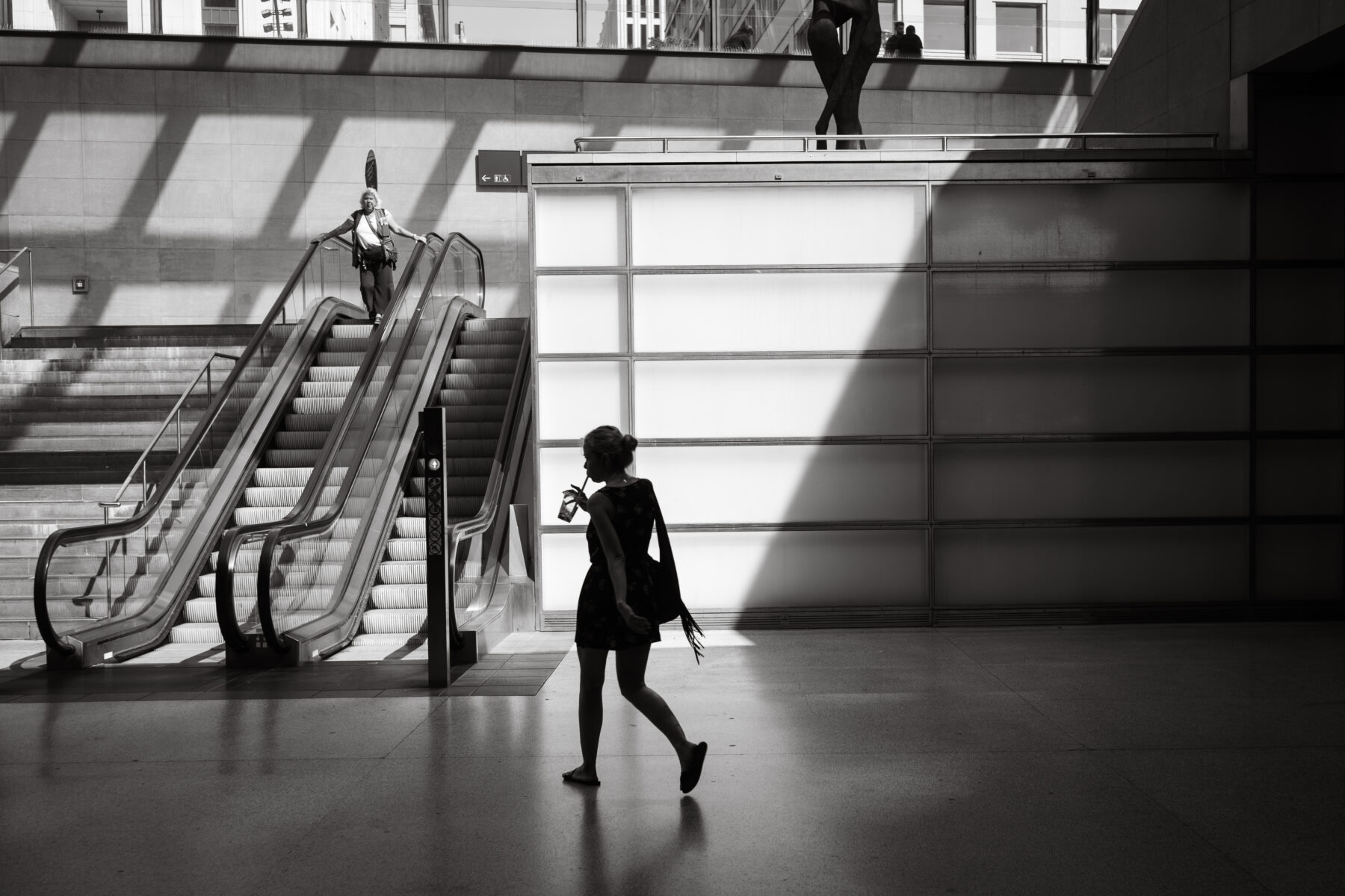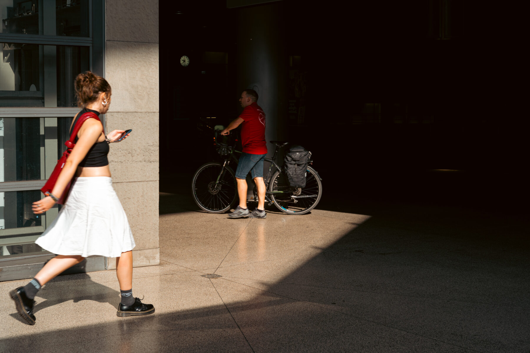 Die Leichtigkeit des Sommers ist auch in der Dunkelheit zu sehen. „Sie trinkt im Laufen Ihren Eiskaffee, bevor die Hitze oben auf der Straße alle Eiswürfel dahinschmelzen wird.“ „Ich brauche etwas Abkühlung.“ denkt die ältere Frau, die auf ihrem Rücken eine Werbefahne für Hop-On-Hop-Off-Touren trägt. Es ist wie ein Katz und Maus Spiel mit der lieben Sonne. „Wir treffen uns in fünf Minuten am Ausgang A.“ ließt die Frau mit der roten Tasche auf ihrem Smartphone. Genau im richtigen Augenblick möchte ich sie erwischen, im kurzen Augenblick zwischen Licht und Schatten. Es glückt!