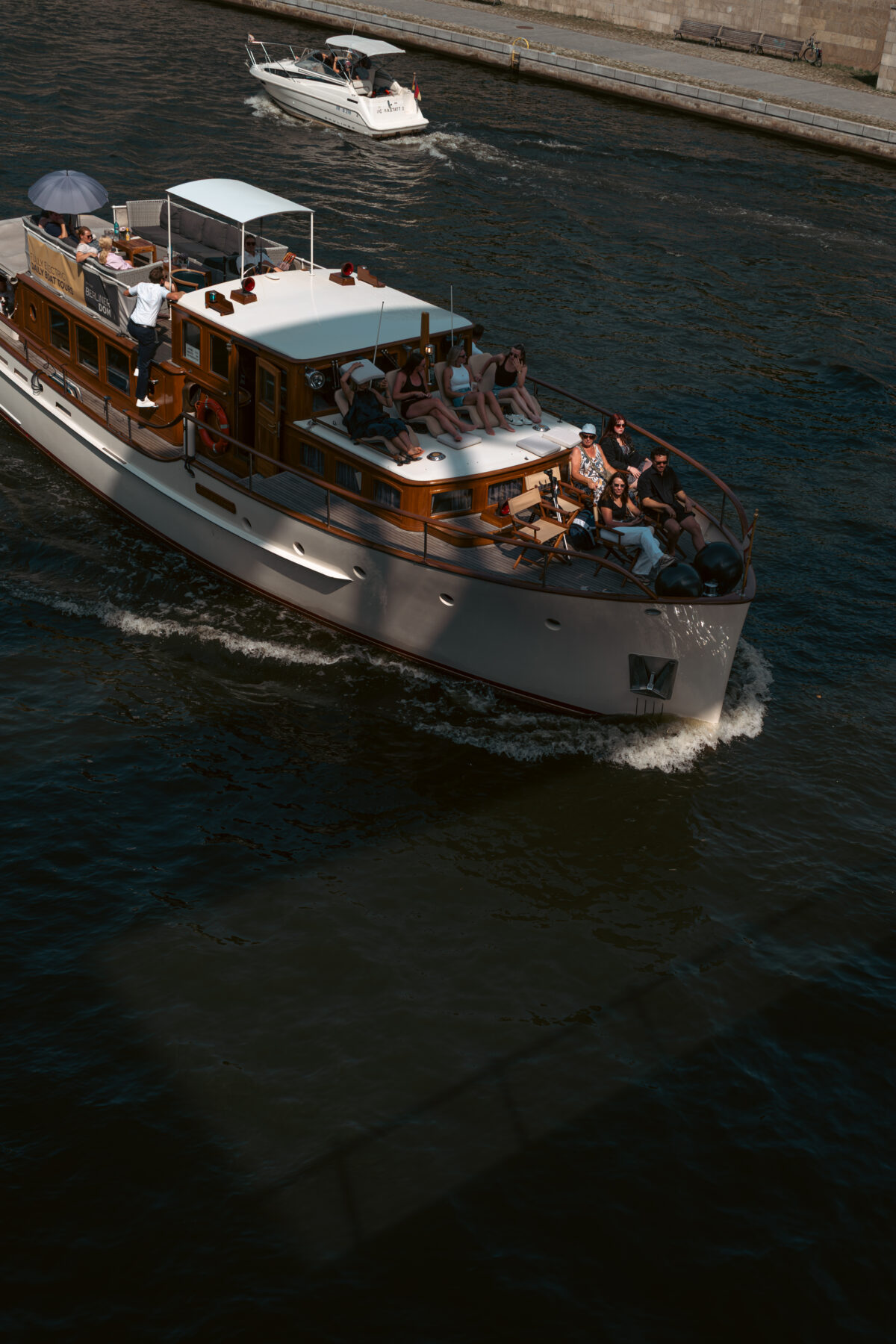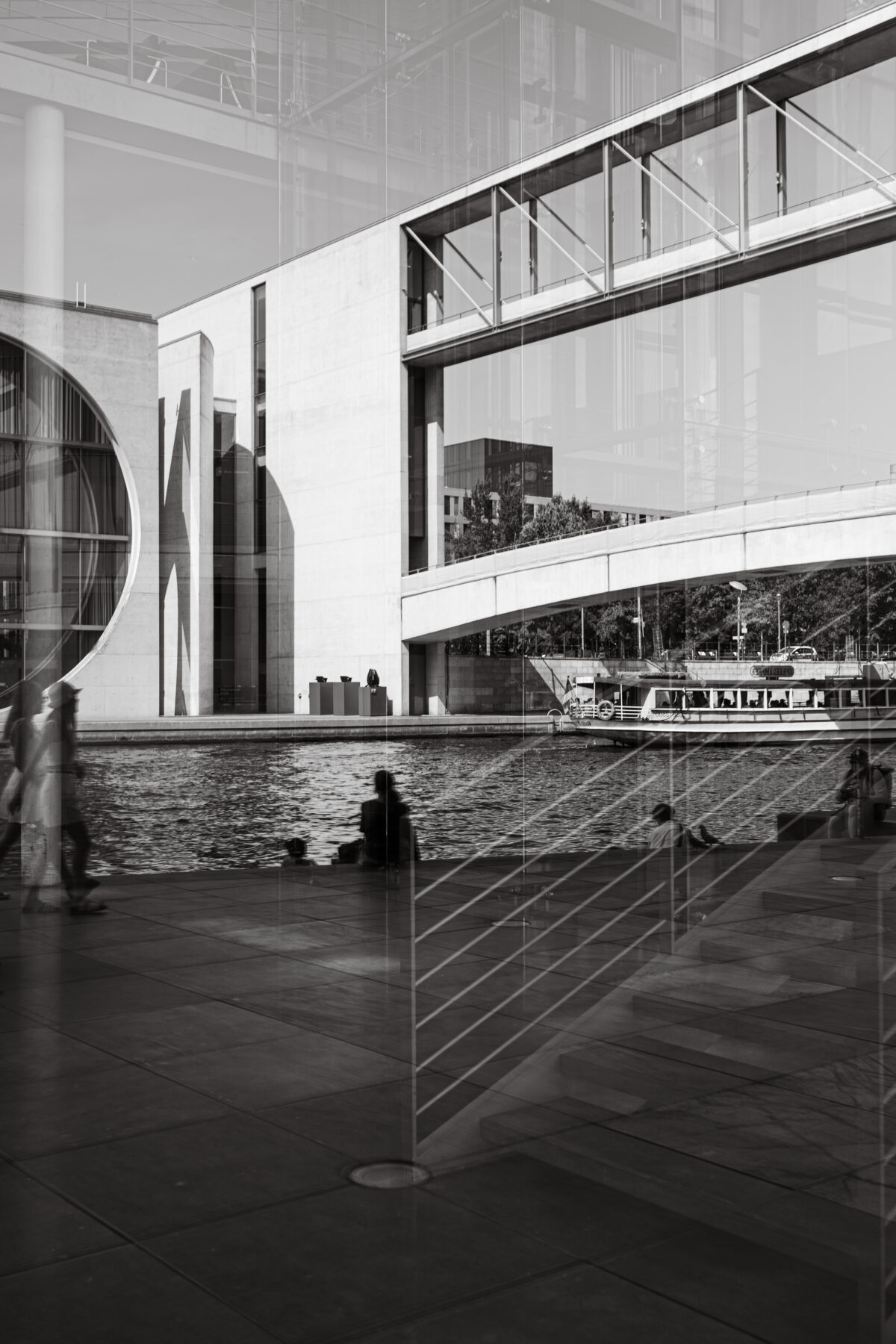 „Alles fließt“ – die Spree durchzieht die Stadt wie eine Lebensader. Immer wieder treffe ich auf sie und schaue den Menschen dabei zu, wie sie diesen Fluß genießen. Beim Regierungsviertel haben wir nach einer Stärkung im Biergarten genug Zeit, um das Wasser und die Gebäude in Szene zu setzen. Ich liebe es auf der großen Fußgängerbrücke zu stehen und den vorbeifahrenden Schiffen und Ausflugsbooten zuzuschauen. Die vielen Geschichten, Gedanken und Gefühle der Passagiere fließen in Sekundenschnelle an mir vorbei.