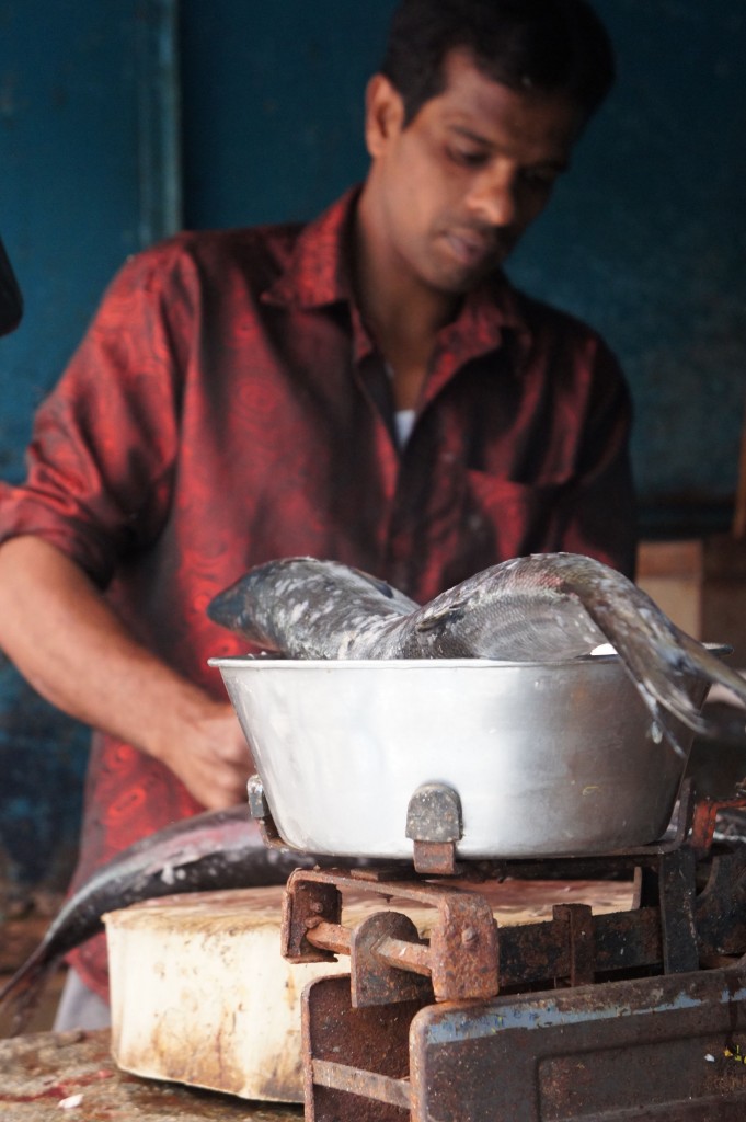 Ein unglaublich strenger Fischgeruch wehte uns um die Nase, als wir den Fischmarkt erreichten. Einige Stände boten viele Sorten an Fisch und anderen Meerestieren an, die alle ohne Kühlung auf den Tresen und Tischen lagen. Schrimps wurden zum Teil gleich auf einer Plastiktüte direkt auf dem Fußboden gepult. Viele Fliegen schwirrten um die Fische herum und auch der Versuch die Fische mit kaltem Wasser frisch zu halten ist bei den Temperaturen zum Scheitern verurteilt. Imteaz kannte einen der Verkäufer und dort sollten sich die beiden einen Fisch kaufen. Es wurde ein großer ausgesucht, gewogen und gleich vor Ort küchenfertig zerlegt. Natürlich auf einem Holzblock mit einen uralten Messer, indisch stilecht eben. Ich musste dann ab und zu um die Ecke gehen, der Fischgeruch war einfach wahnsinnig intensiv.