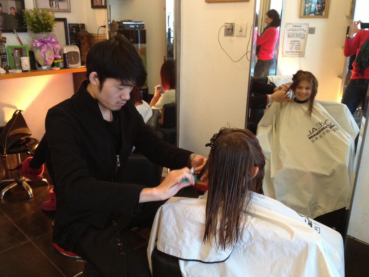 Außerdem stand ein Besuch beim Friseur auf dem Programm, denn unsere große Tochter wollte sich von ihren langen Haare trennen. Nachdem ich schon ein bisschen die nähere Umgebung erkundet hatte, sollte es ein Friseursalon in Laufweite sein, den ich vor ein paar Tagen mit dem Fahrrad entdeckt hatte. Wir hatten sogar Glück und er war trotz des Neujahrsfestes geöffnet. Es war nur eine Kundin dort, die von zwei Angestellten betreut wurde. Die Inneneinrichtung glich eher wie einem Wohnzimmer mit viel Dekoration, Sesseln und einer Buddhastatue auf dem Kassentresen. Im Fernsehen lief ein Horrorfilm und Charlotte wollte gleich wieder raus rennen, denn das Blut spritzte förmlich aus dem Bildschirm. Ich bat den Fernseher auszustellen und man kam meiner Bitte auch nach (mit einem Schmunzeln im Gesicht, wahrscheinlich dachten die: mein Gott, was für eine hysterische Mutter). Der Service war dann allerdings ganz gut. Vom Preis ganz zu schweigen, 20 RMB umgerechnet 2,40 € kostete dort ein Haarschnitt für Kinder inklusive waschen. Nur angemerkt: hier zahlt man teilweise 10 RMB mehr für eine Tasse Kaffee im Restaurant.