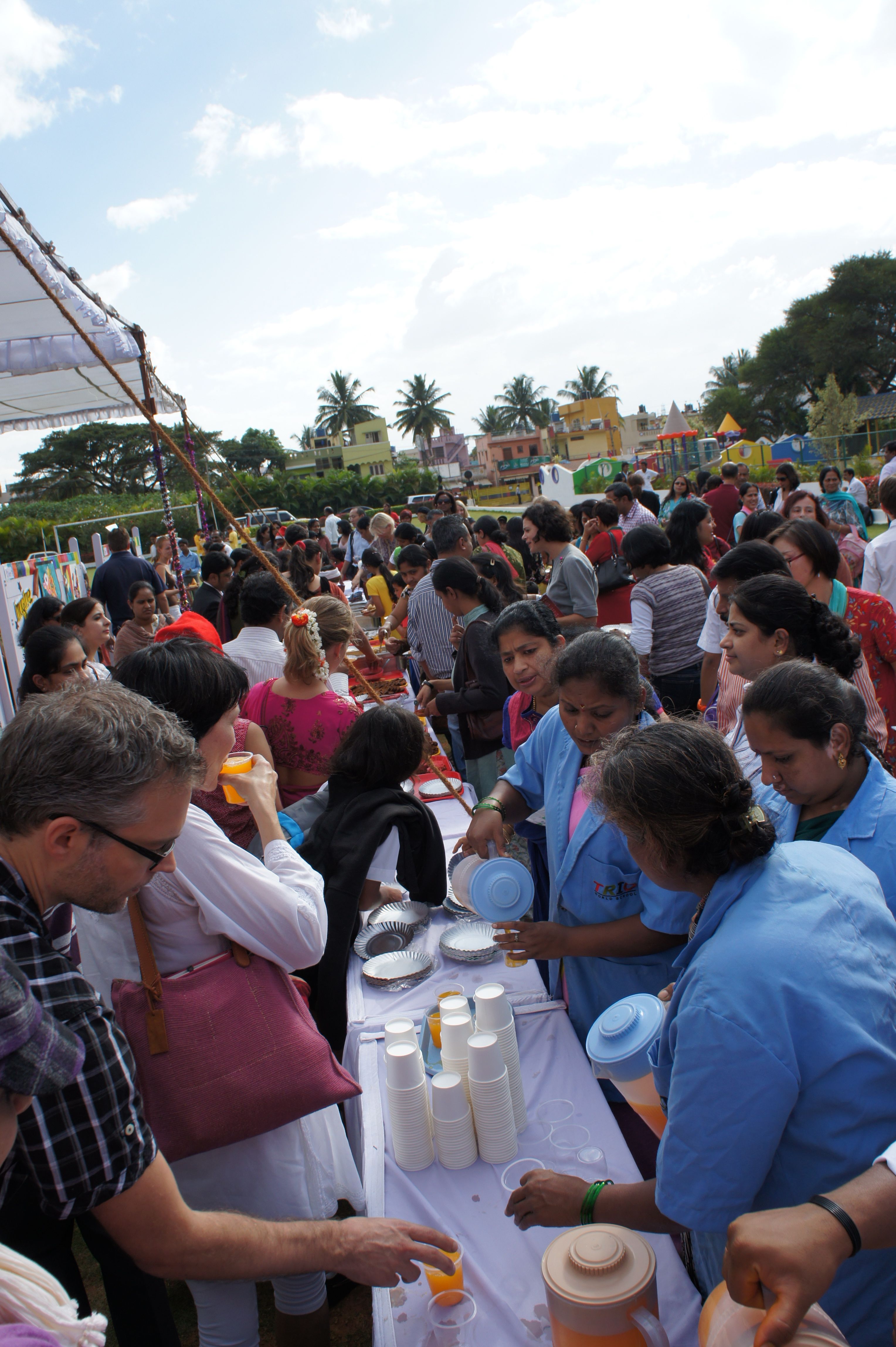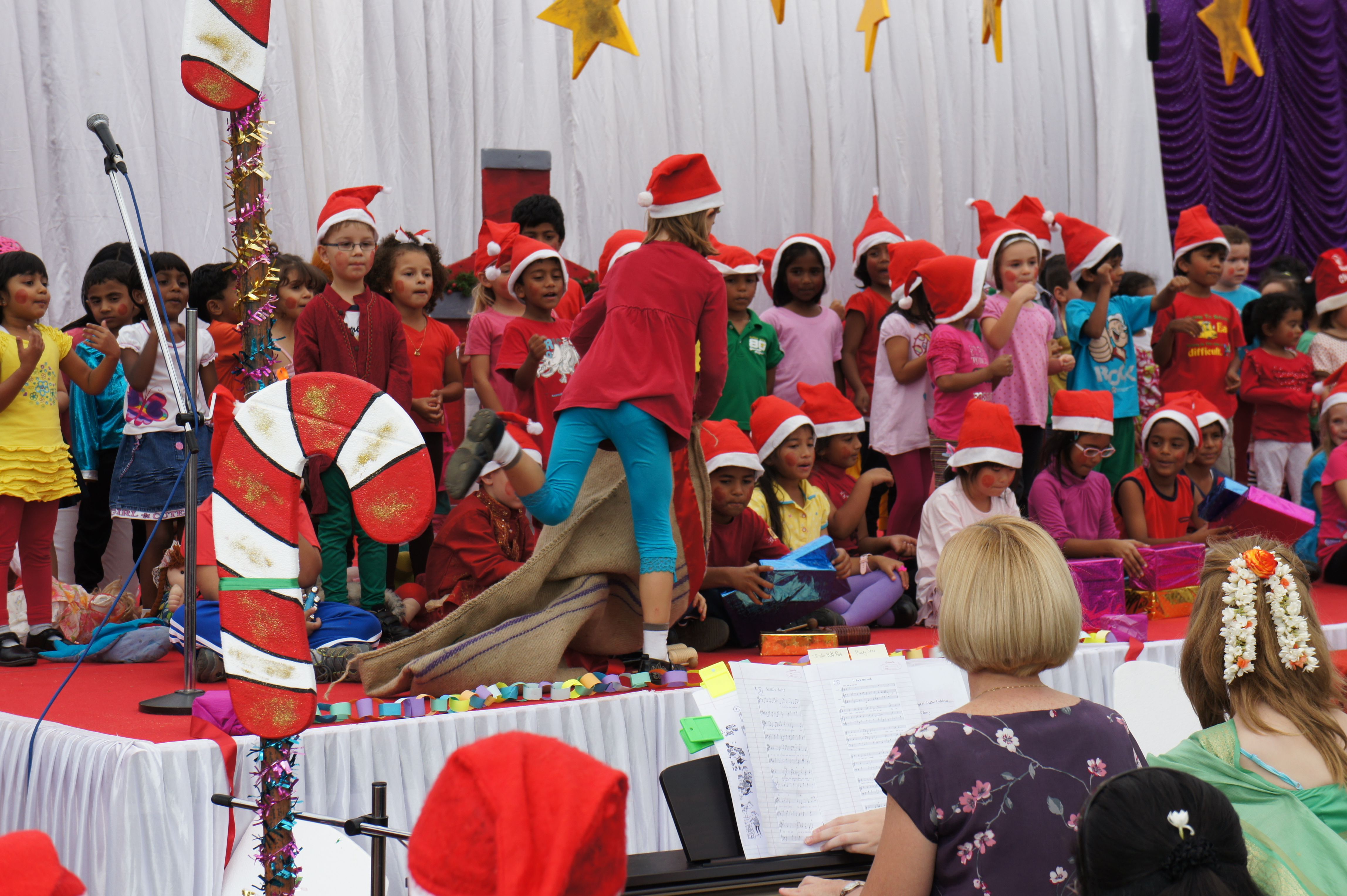 Aber Dank unserer Kinder hatten wir auch hier in Indien richtig viel Adventsstimmung, inklusive Nikolaus, der den Weg nach Bangalore gefunden und sogar deutsche Schokolade im Gepäck hatte. Die Schule veranstaltete ein tolles Weihnachtskonzert, bei dem unsere große Tochter englische Weihnachtslieder singen konnte. Sie kann jetzt wenigstens den Text von Jingle Bells. Ein besonderes Highlight waren der Besuch des Weihnachtsmarktes und der Weihnachtsfeier. Auf dem Markt gab es statt gebrannter Mandeln eben Zuckerwatte und Popcorn, aber Hauptsache süß. Die Weihnachtsfeier wurde von deutsche Firmen hier in Bangalore organisiert und war ein tolles Fest für die ganze Familie. Neben deutschem Essen (Rotkraut, Schweinebraten, Spätzle, Leberkäse, Wiener Würstchen …) war der Besuch des Weihnachtsmannes für die Kinder sehr aufregend. Jeder erhielt ein Geschenk und musste dieses persönlich beim englisch sprechenden Weihnachtsmann und seinem Helfer Knecht Ruprecht abholen.