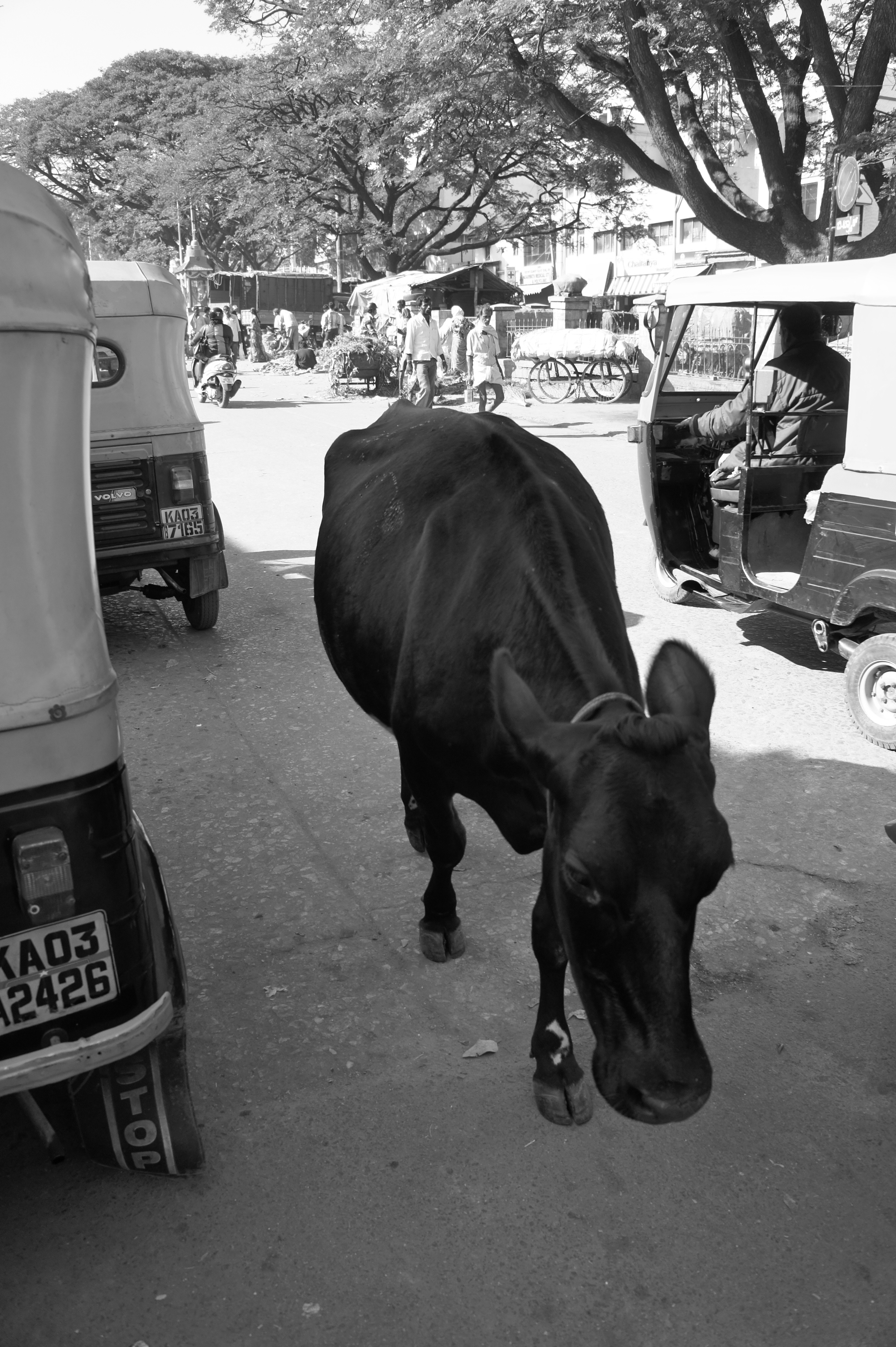 Mittendrin laufen die heiligen Kühe gemächlich durch den rasenden Verkehr. Auf der Suche nach Futter treiben sie sich den ganzen Tag draußen herum, manchmal sind sie auch am Straßenrand angebunden. Schlimm anzusehen sind die dickbäuchigen Exemplare, die vom vielen Plastikessen aus dem Müll ganz aufgebläht sind. Mehrere Kilogramm Plastikmüll wurden schon in einer verendeten Kuh gefunden. Einige der Kühe (weiße, mit langen Hörnern) werden auch zu Transportzwecken eingesetzt, sie ziehen kleine Anhänger mit Waren oder Baumaterial.